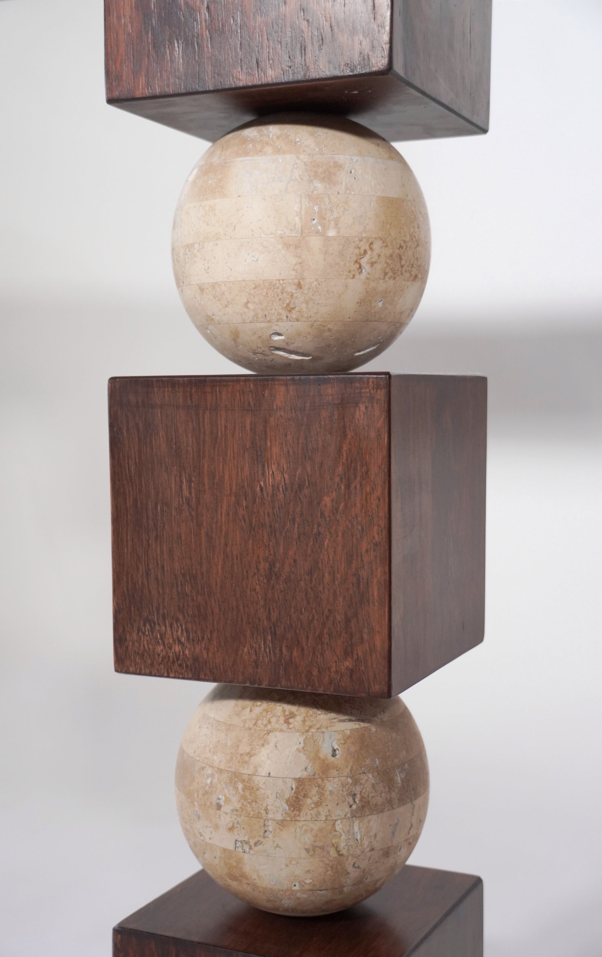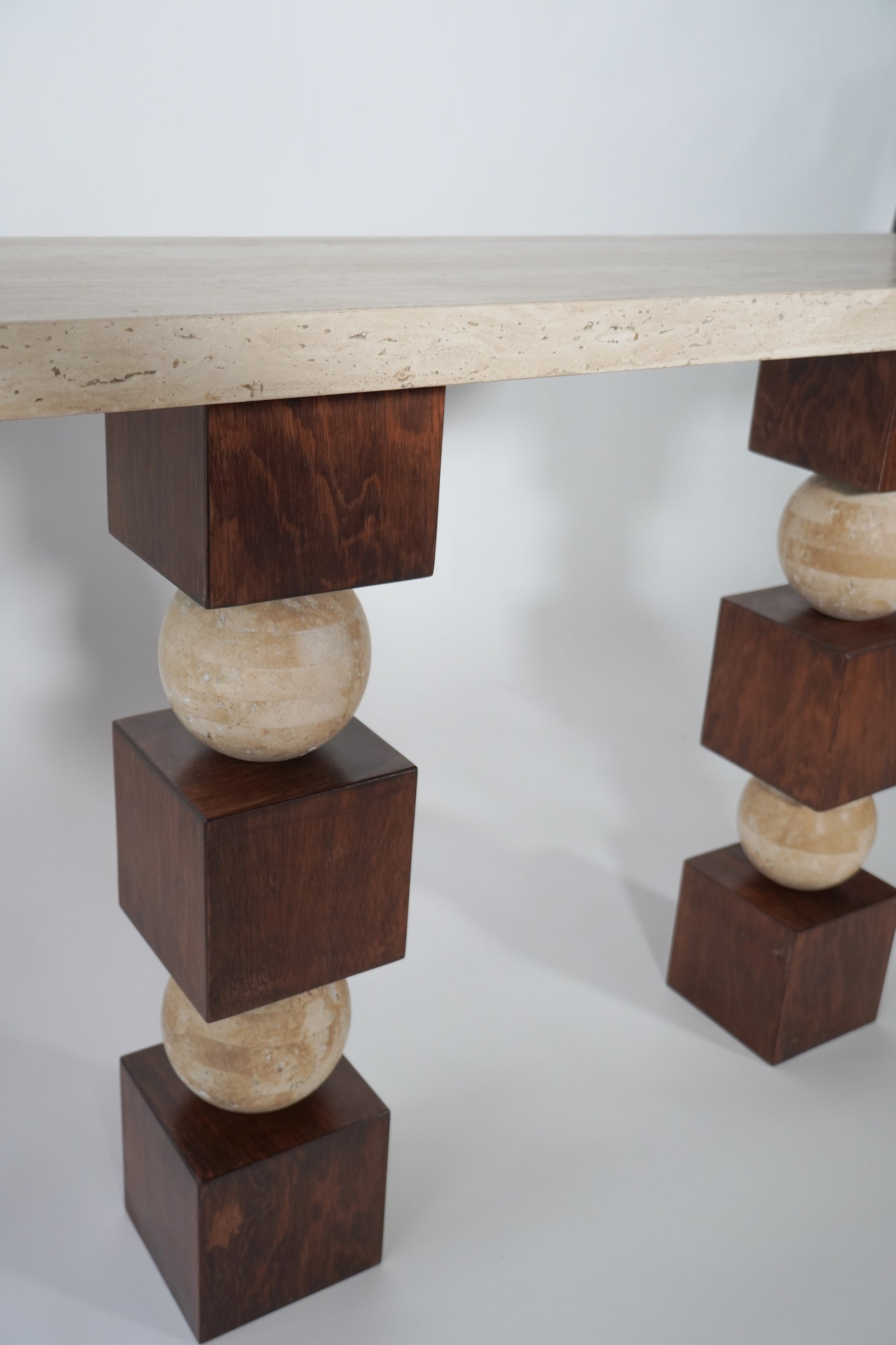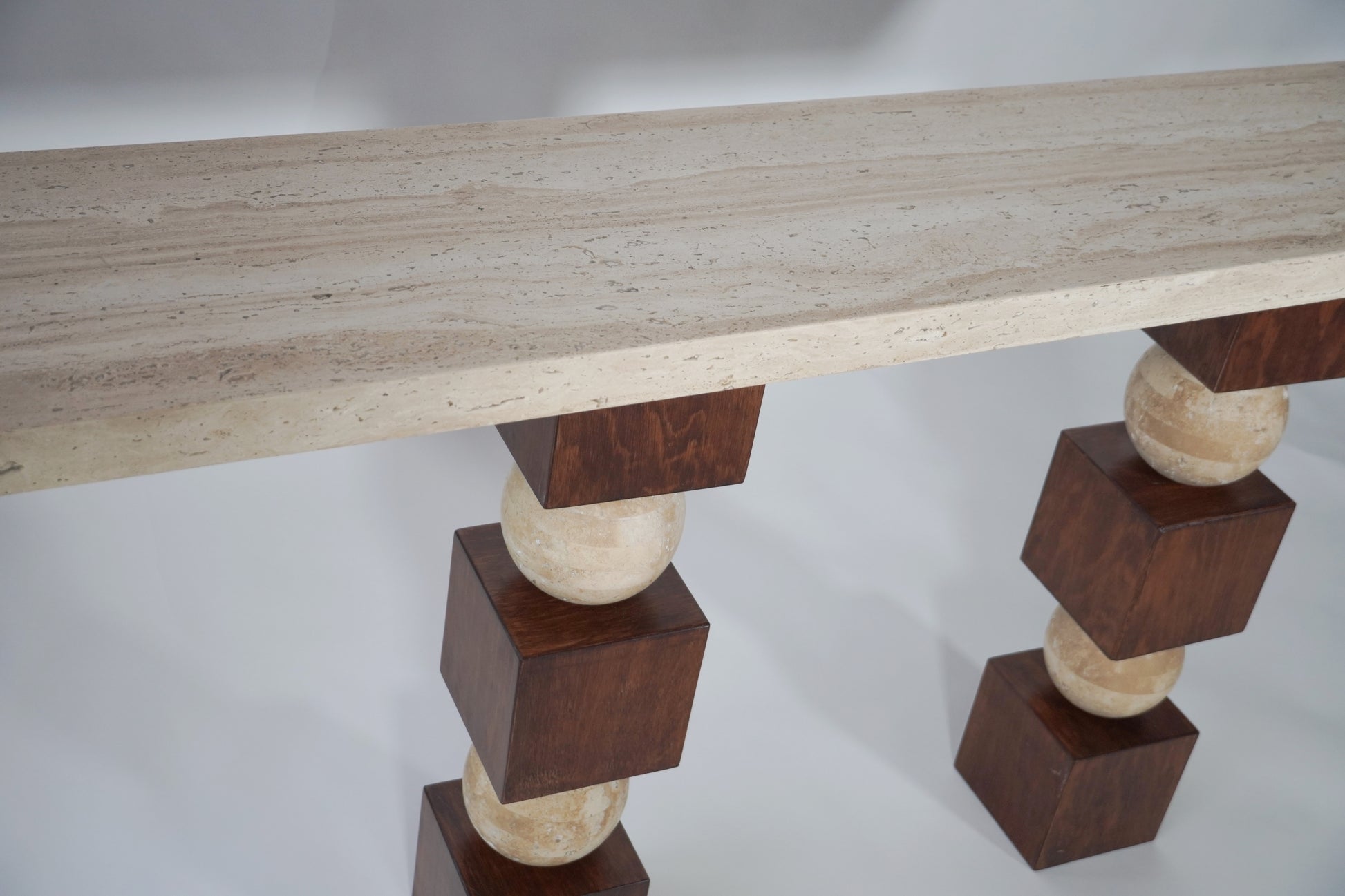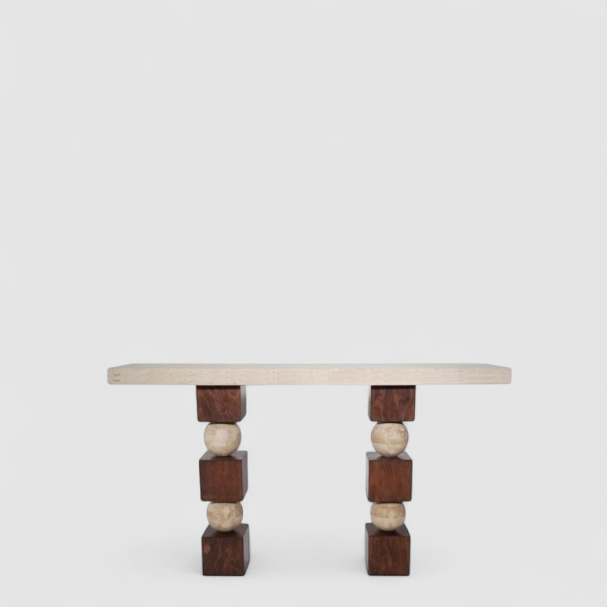 Esculpida en mármol travertino y madera sólida, evoca la fuerza de la naturaleza y la profundidad de nuestros cimientos.