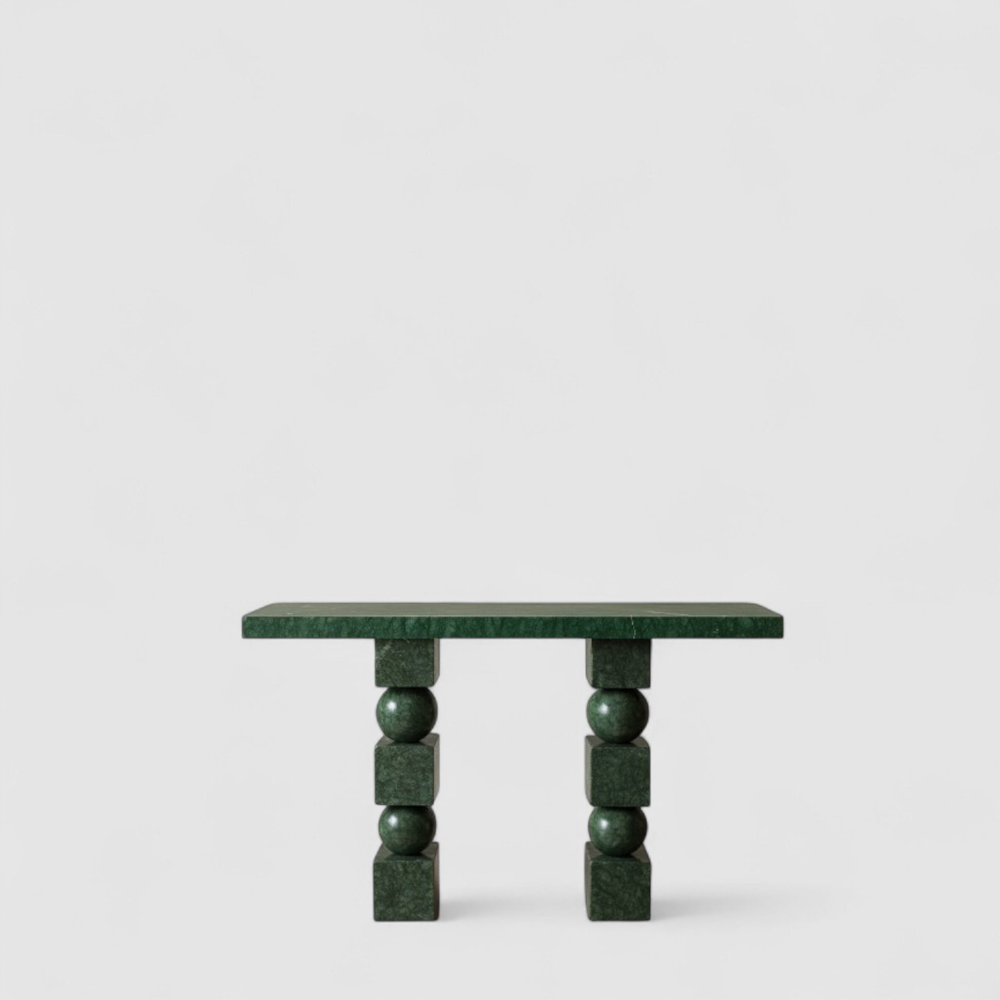 Fabricada en mármol verde tikal, diseño vanguardista geométrico con esferas y cubos esculpidos en mármol sólido.