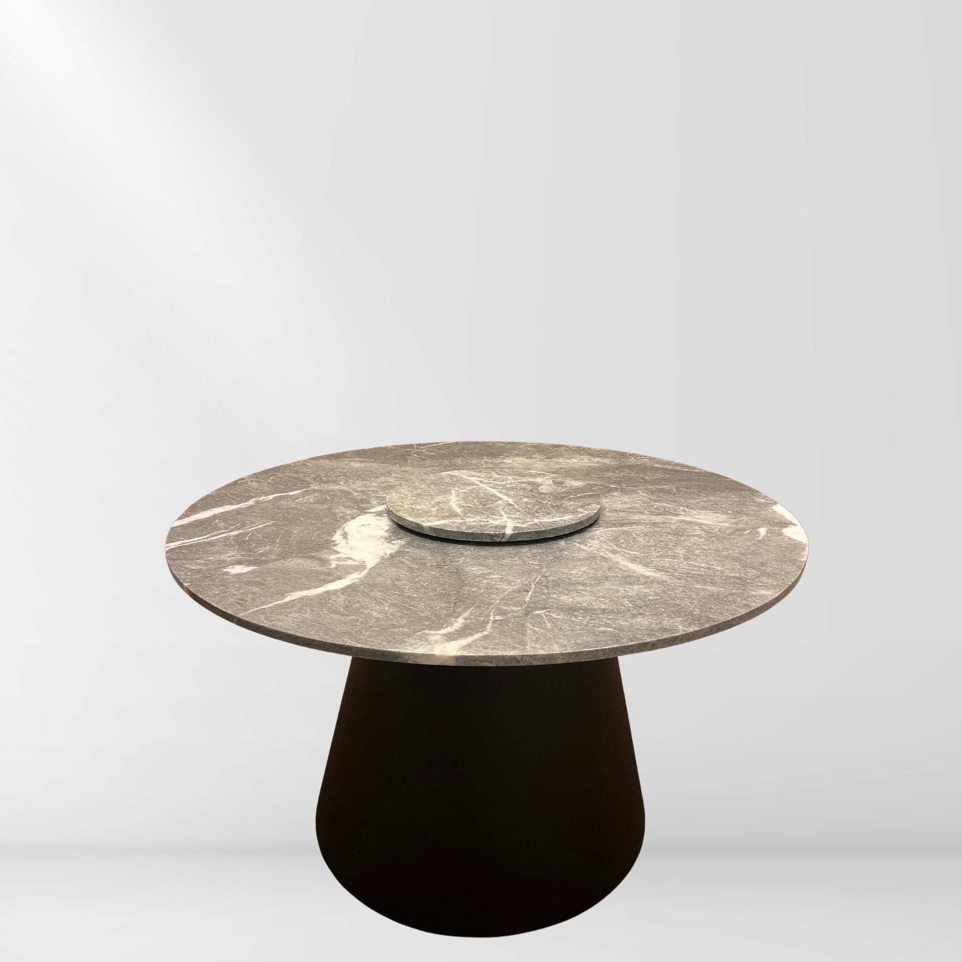 Mesa Andes, con lazy susan integrada. Cubierta en mármol gris modena, base de acero robusta, perfecta para espacios contemporáneos y funcionales.