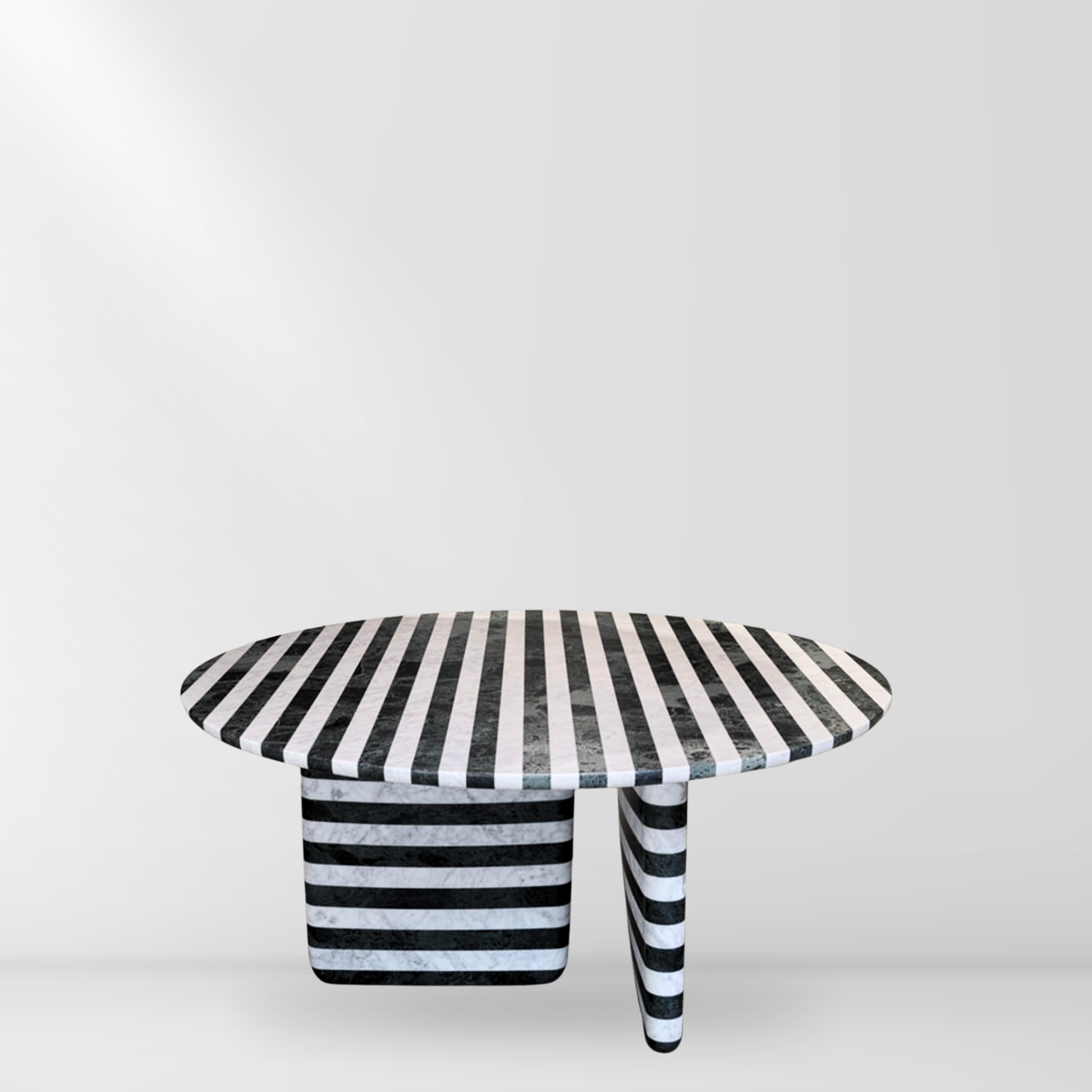 La Mesa Latiff es una pieza de lujo contemporáneo que destaca por su diseño audaz y su elegante combinación de materiales. Fabricada con mármol de Carrara y mármol negro Querétaro, esta mesa presenta un patrón distintivo de rayas alternas, creando una apariencia visualmente impactante y sofisticada.