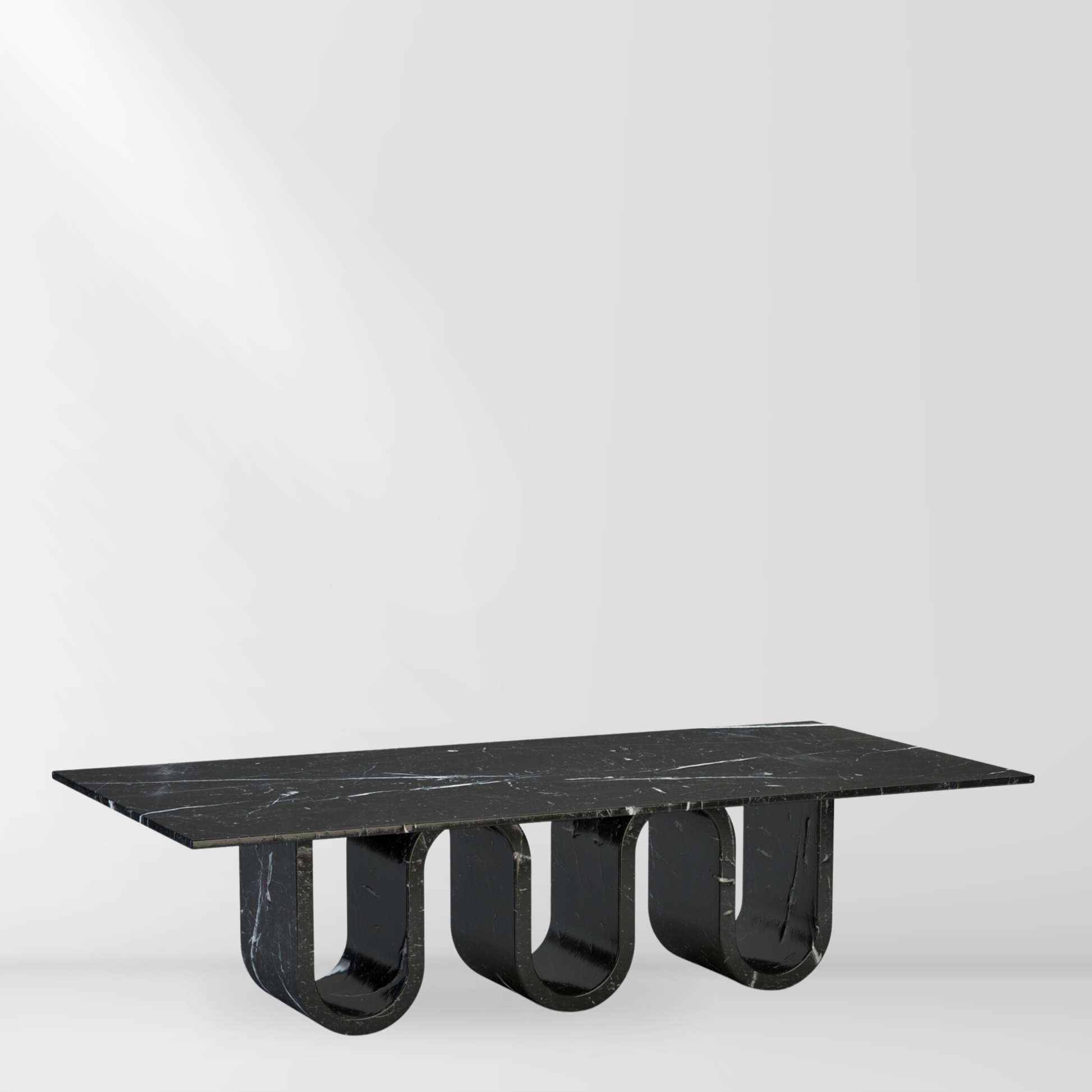 Mesa Marquina, presenta una superficie elegante y sofisticada, caracterizada por sus vetas blancas naturales que contrastan bellamente con el fondo oscuro. La base está compuesta por curvas de mármol, esculpidas artesanalmente, lo que añade un elemento de diseño distintivo y una sensación de movimiento fluido a la estructura..