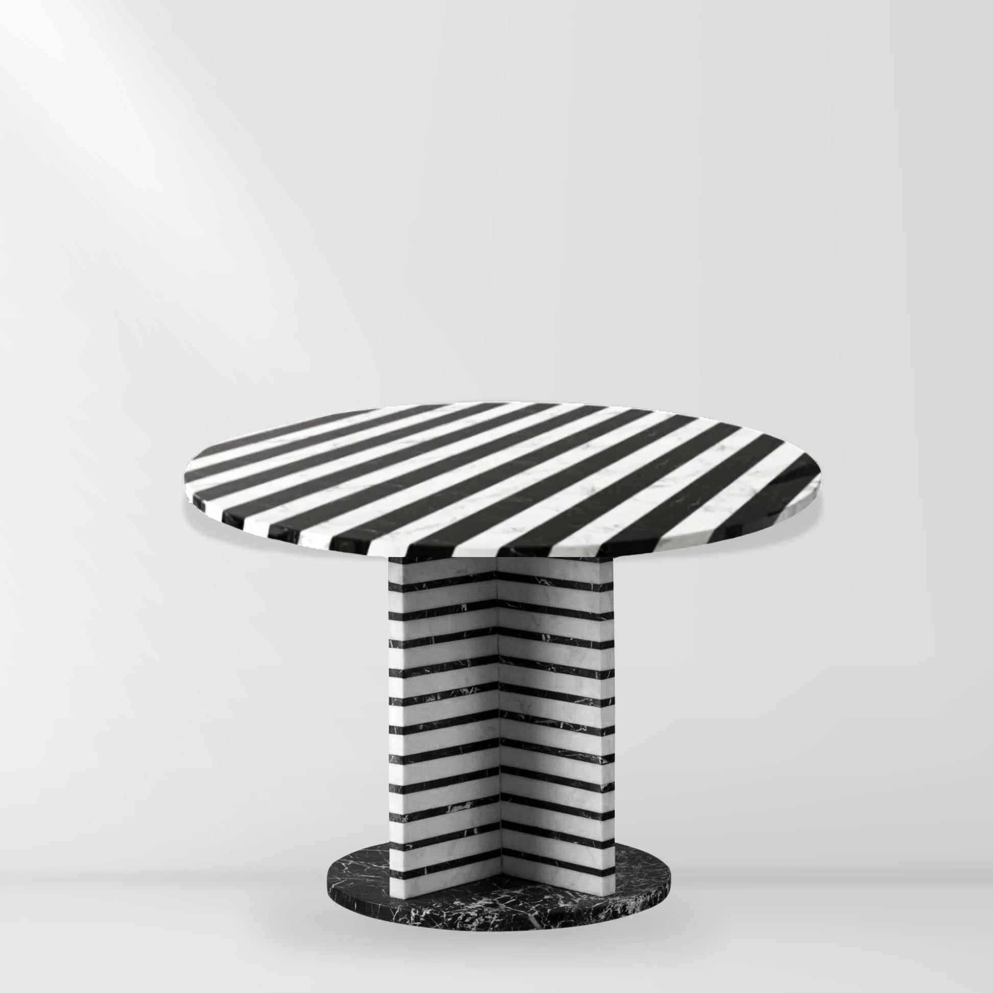 Mesa Mikhalis, de recibidor fabricada en mármol Negro Monterrey y Carrara con diseño a rayas. Cuenta con una cubierta circular de 1 m de diámetro y una estructura de 2 módulos a rayas en mármol sólido y una base redonda de mármol negro Monterrey.