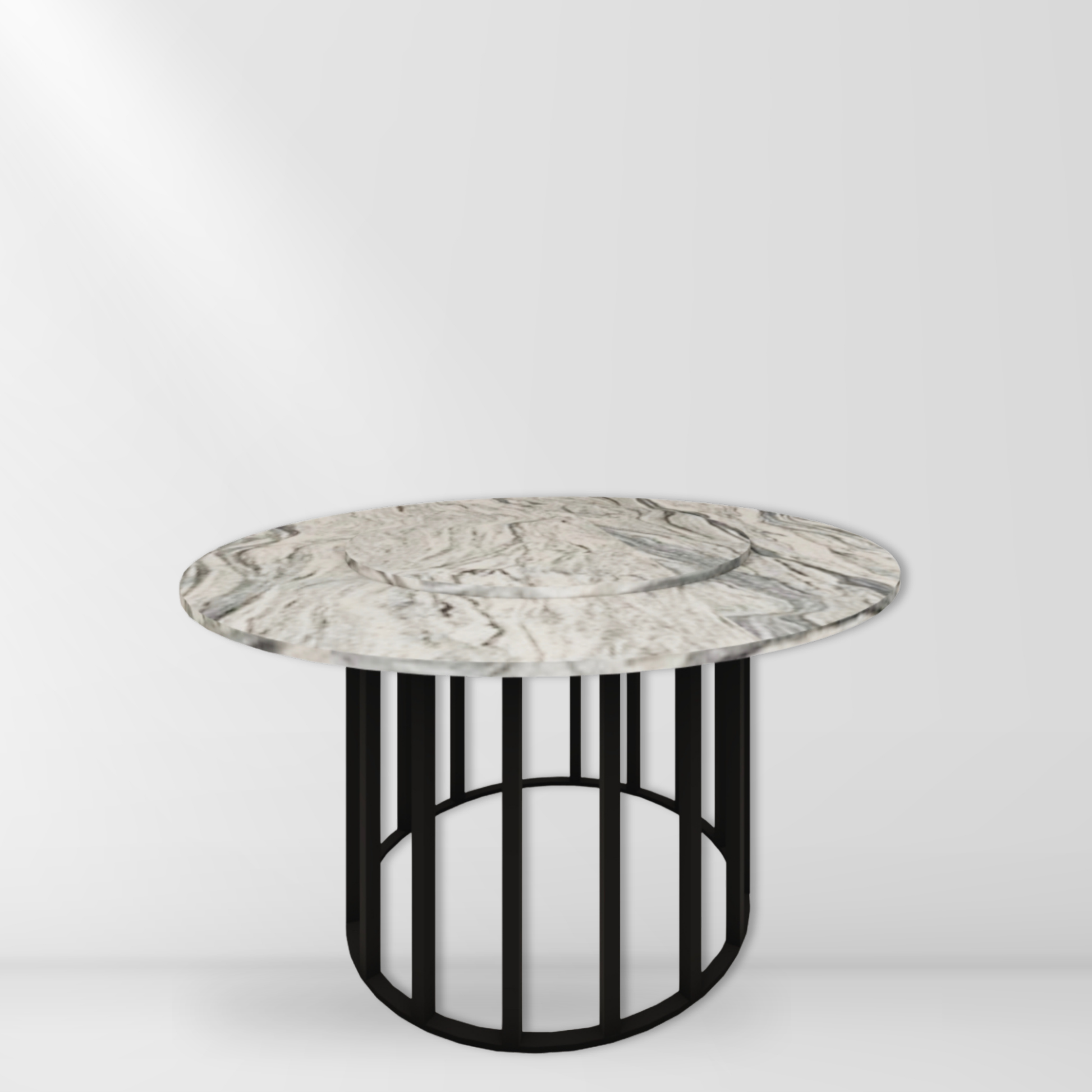 Mesa Tavolo es una mesa ideal para exterior fabricada en granito viscount white con lazy susan incluída de .90cm y una sólida base en acero matte. La pieza ideal para terrazas de exterior.